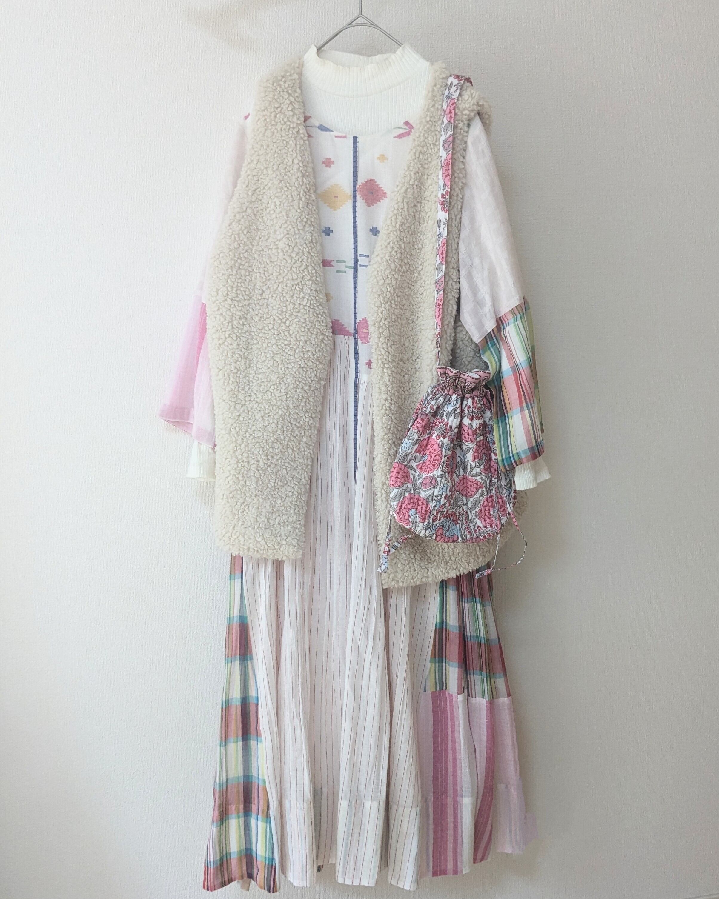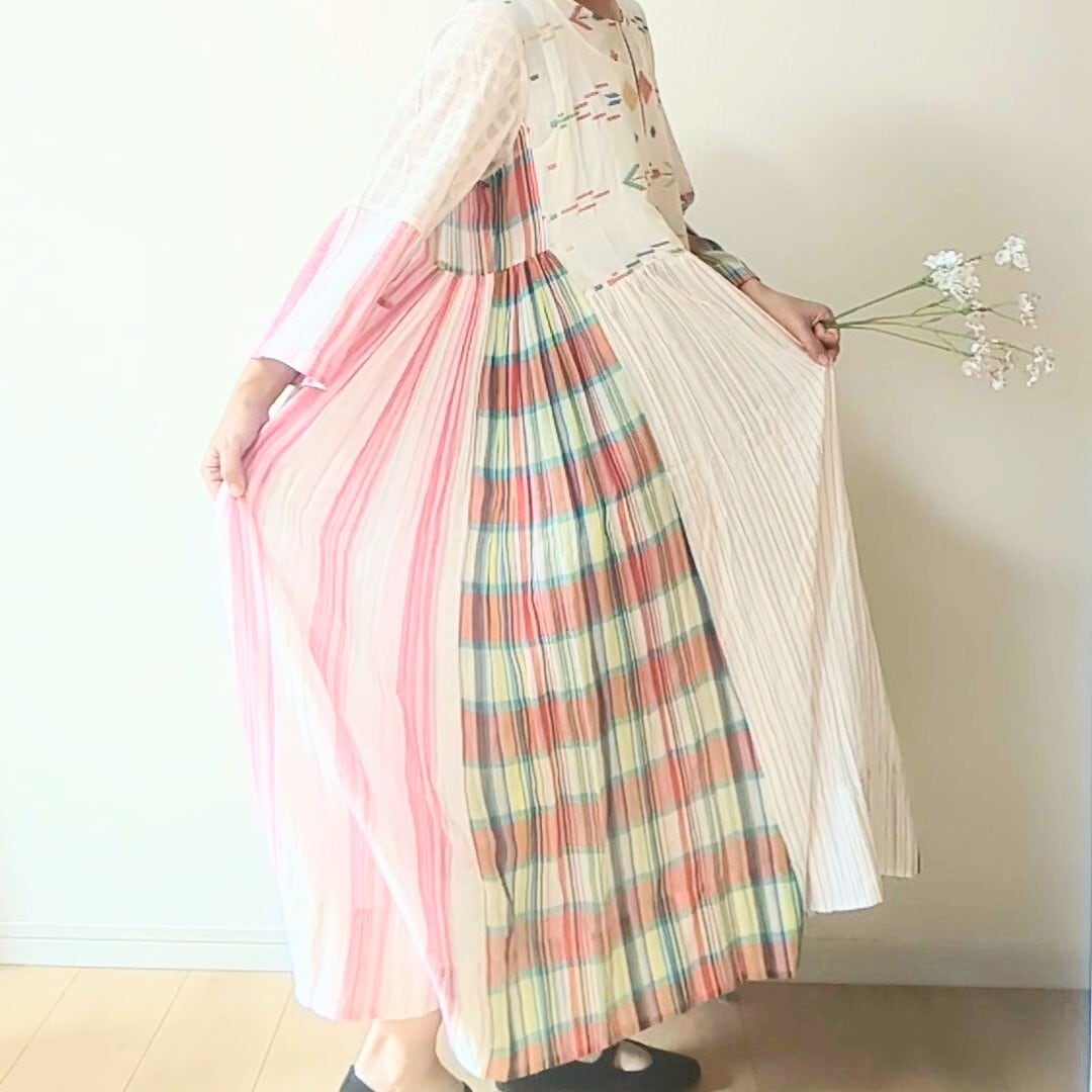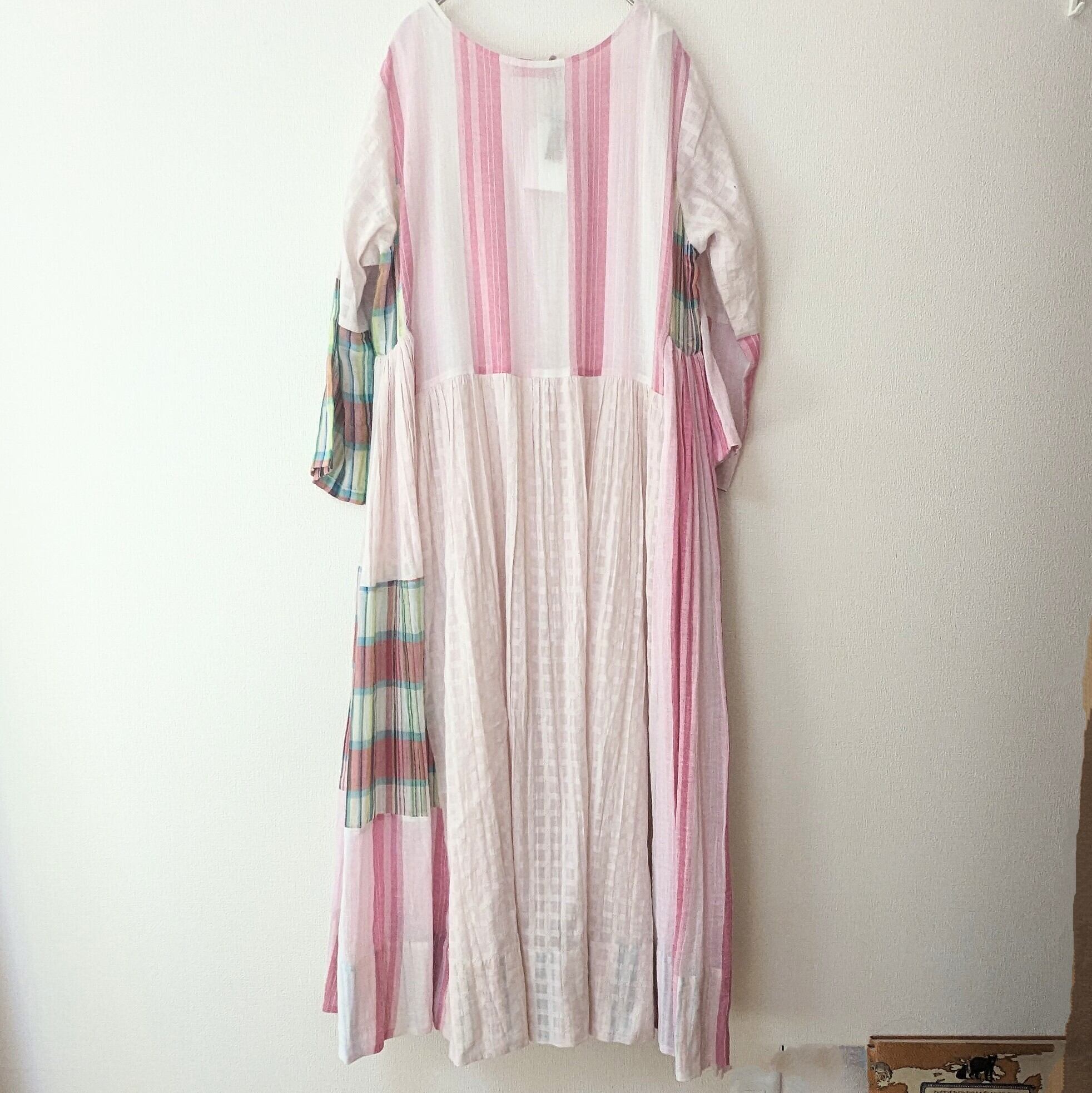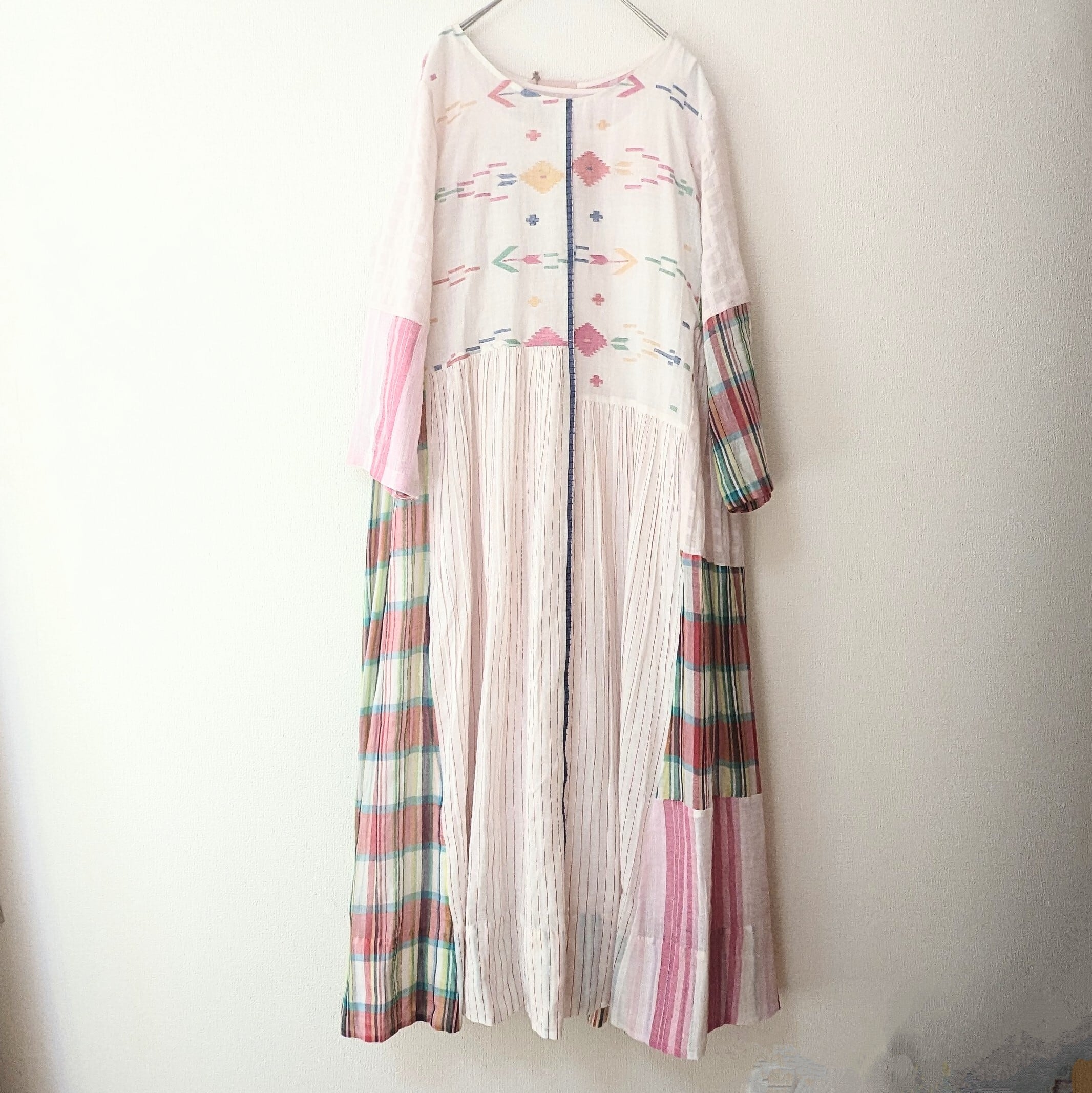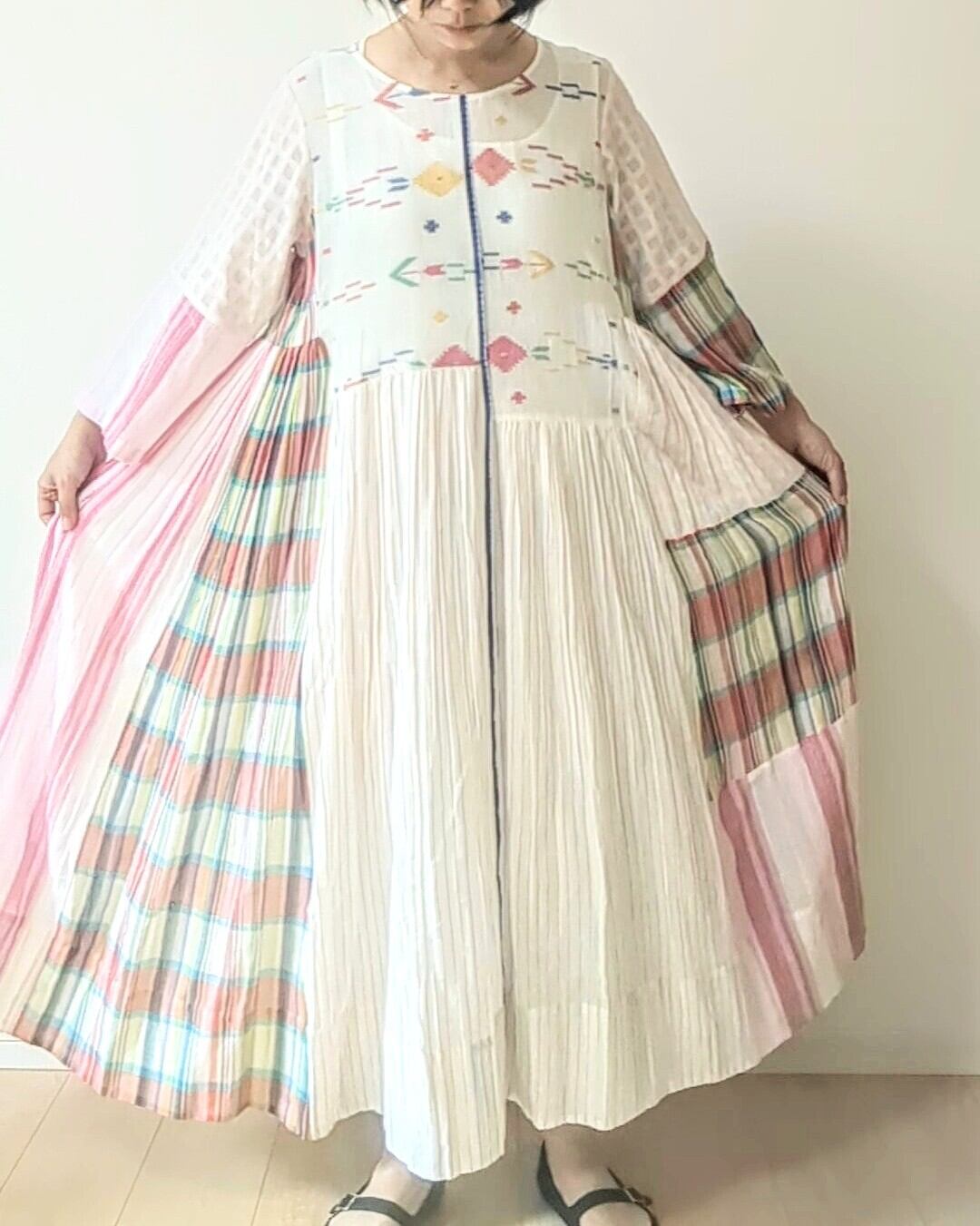 【三春】ジャムダニ織×カディコットン インドの手仕事布 パッチワーク ワンピース