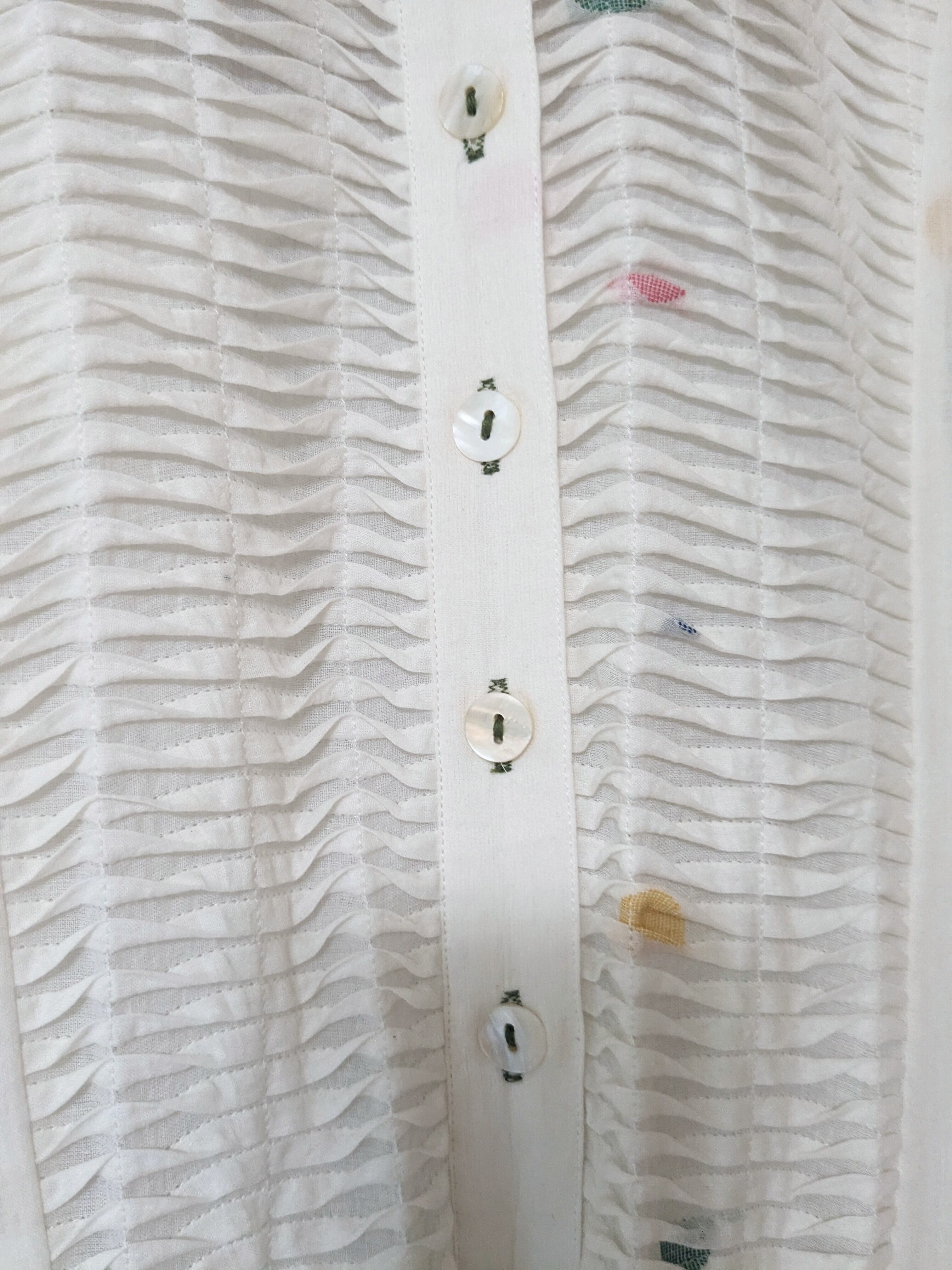 アレンジを加えたピンタックや袖の縁取り刺繍など、